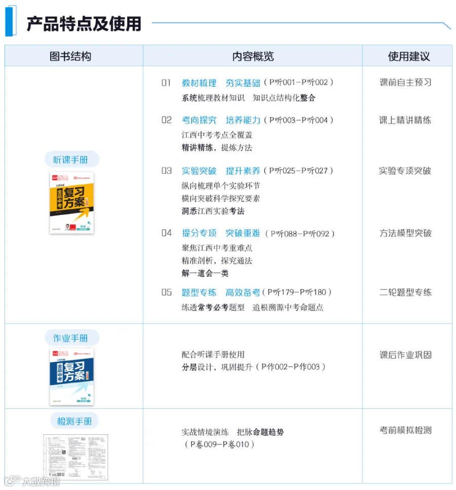针对江西中考的常考必考题型,听课手册配套课时作业,题目精挑细选,分层设计,循序渐进,高效练习,巩固提升。