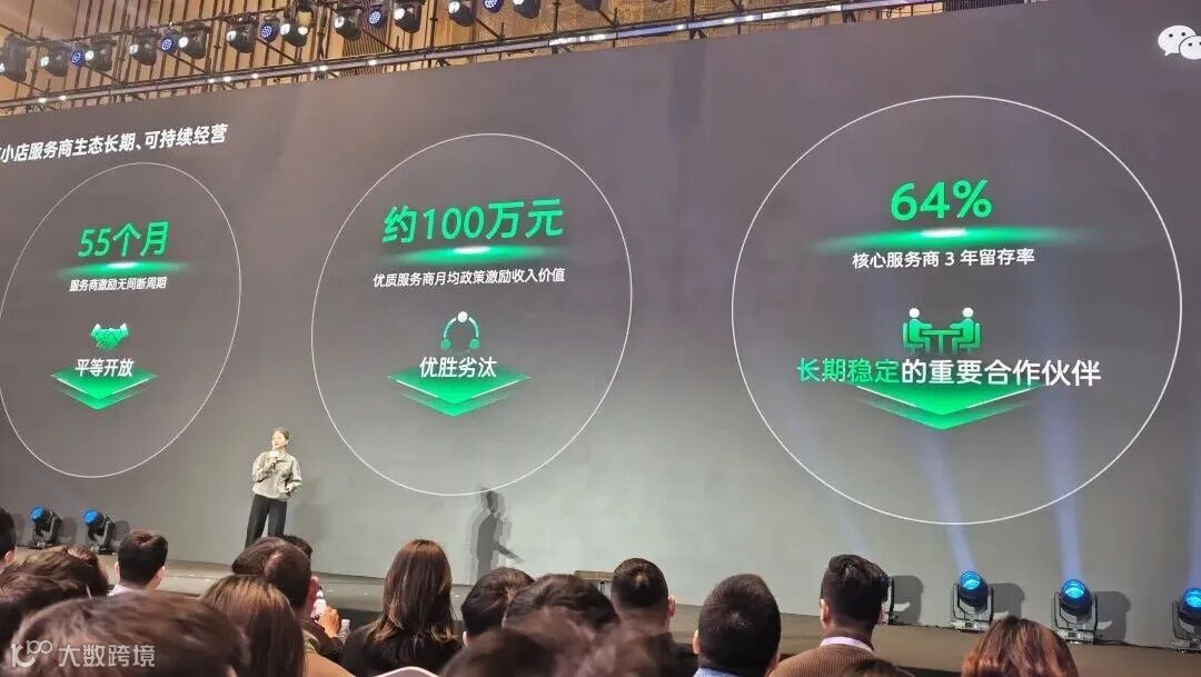 首先体现在投入方式上。微信小店的服务商激励政策已连续 55 个月无间断运行。与阶段性补贴不同,这一投入持续覆盖完整周期,并以留存结果作为验证——核心服务商3年留存率达 64%,优质服务商月均政策激励收入价值约 100 万元。