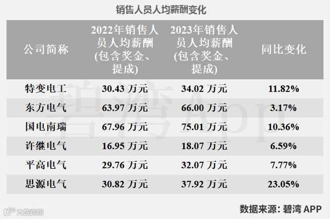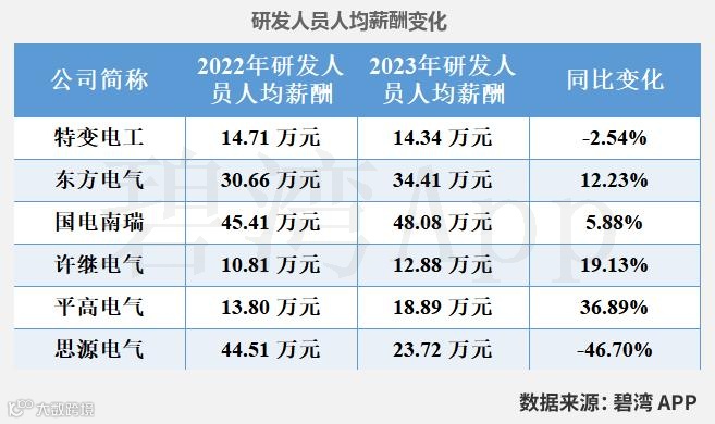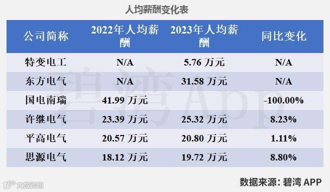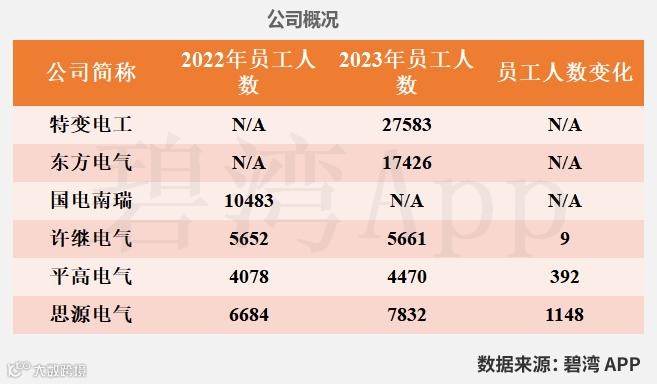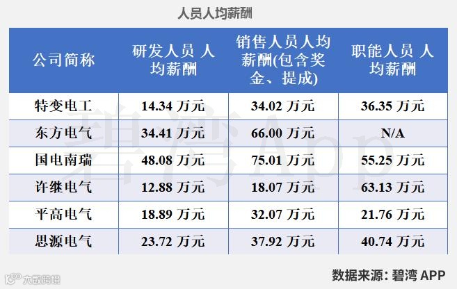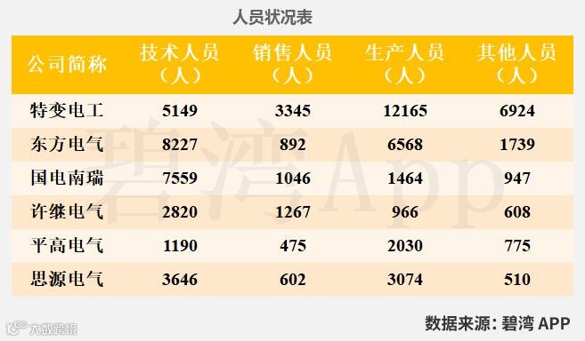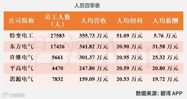 根据许继电气(000400)、思源电气(002028)、特变电工(600089)、平高电气(600312)、国电南瑞(600406)、东方电气(600875)公开披露数据,对6家公司的营收、人员效率等数据统计如下(本文中的员工薪酬包含福利以及五险一金):