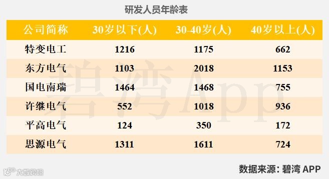国电南瑞是30岁以下员工最多的公司,为1464人,占总研发人数的39.71%,与其相对的,东方电气是40岁以上人数最多的公司,为1153人,占总研发人数的26.98%。