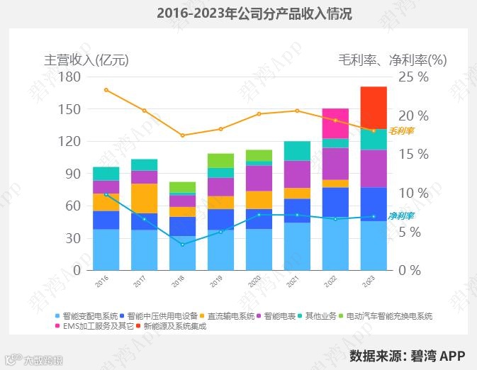 2023年公司的主营业务为电气机械及器材制造业,主要产品包括智能变配电系统、新能源及系统集成、智能电表、智能中压供用电设备四项,智能变配电系统占比26.83%,新能源及系统集成占比23.10%,智能电表占比20.42%,智能中压供用电设备占比18.41%。
