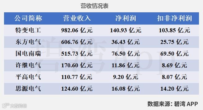 通过年报我们可知,2023年各家公司的经营状况都较好,没有净利润为负的情况,其中特变电工是2023年净利润最多的公司,除此之外,它还是全年营收最高的公司,为982.06 亿元。平高电气是2023年扣非净利润最低的公司,为8.07 亿元。