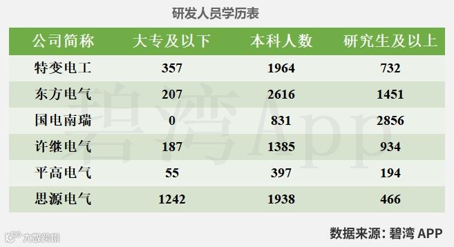 东方电气是研发人数最多的的公司,国电南瑞是高学历人数最多的的公司,是总研发人数的77.46%,研发实力强劲。思源电气是大专及以下人数占比最高的公司,占总研发人数的34.06%,国电南瑞是大专及以下人数占比最低的公司,甚至达到了0%,所有研发人员为本科以上学历,展现出强劲的研发实力。