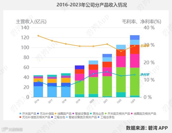 2023年公司的主营业务为输配电设备行业,主要产品包括开关类及相关产品、线圈类及相关产品、无功补偿类及相关产品三项,开关类及相关产品占比44.80%,线圈类及相关产品占比22.04%,无功补偿类及相关产品占比14.85%。
