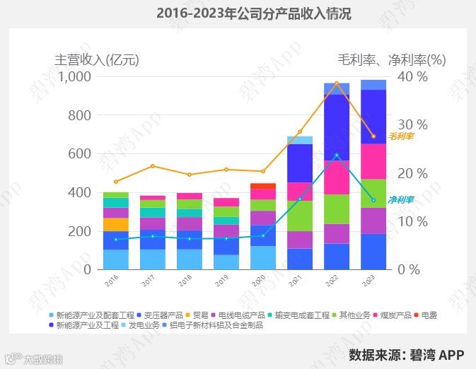 2023年公司的营收主要由以下三块构成,分别为新能源产业及工程、变压器产品、煤炭产品。