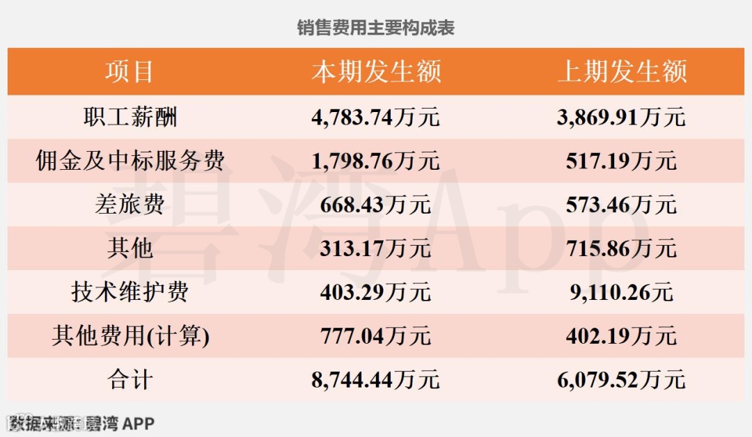 但是(1)职工薪酬本期为4,783.74万元,去年同期为3,869.91万元,同比增长了23.61%;(2)佣金及中标服务费本期为1,798.76万元,去年同期为517.19万元,同比大幅增长了近2倍。