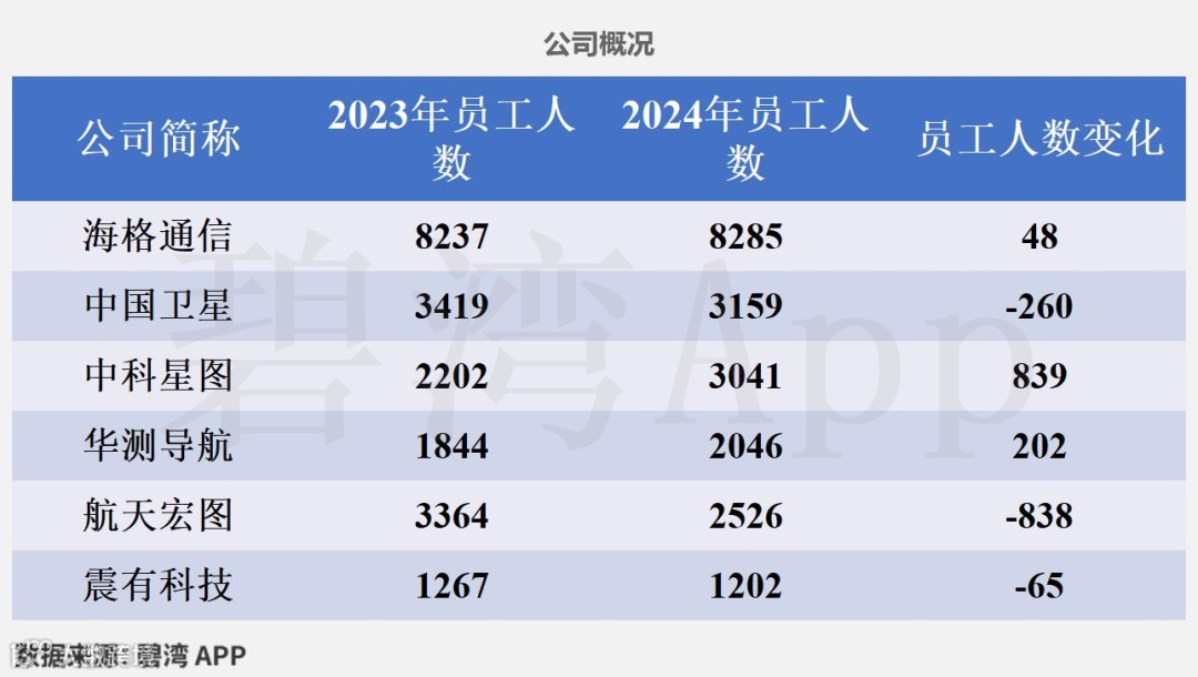 在员工总数变化上,中科星图表现最为亮眼,从2023年的2202人增长至2024年的3041人,增幅达到38.1%。相反地,航天宏图经历了显著的人数缩减,减少了838名员工。整体而言,海格通信和华测导航也有所增长,但增速相对温和。