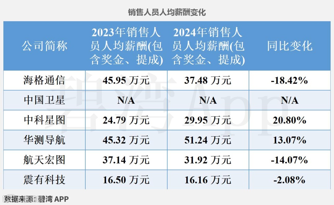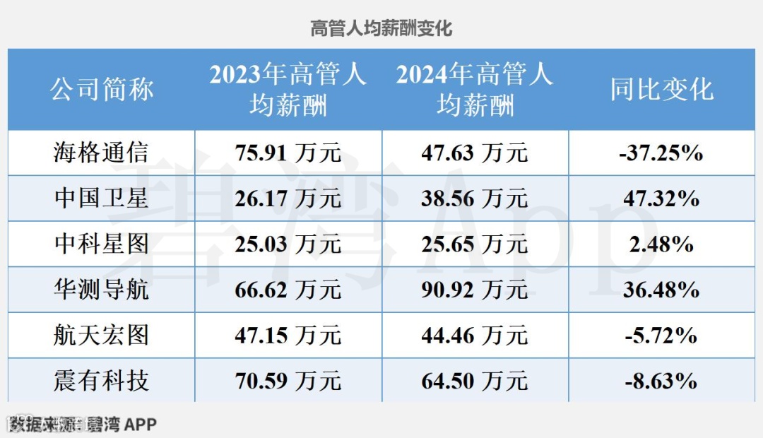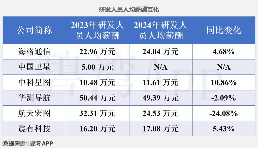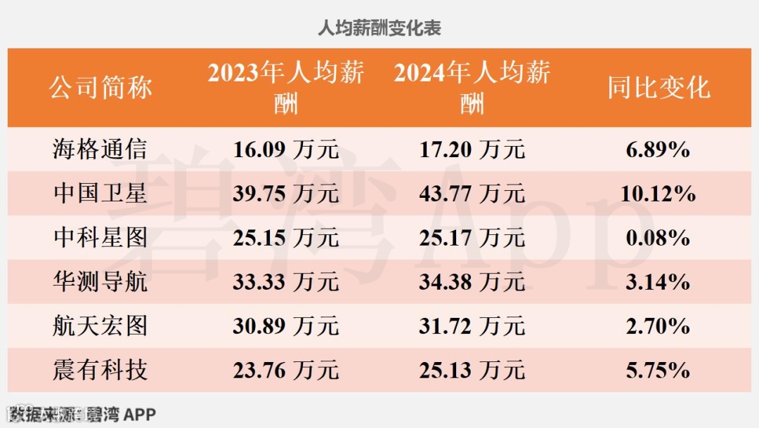 所有公司在2024年的人均薪酬都有所增长,其中海格通信增幅最大,达到6.89%。中国卫星和华测导航的增幅分别为10.12%和3.14%。即便在亏损情况下,航天宏图的人均薪酬仍小幅上涨了2.70%。