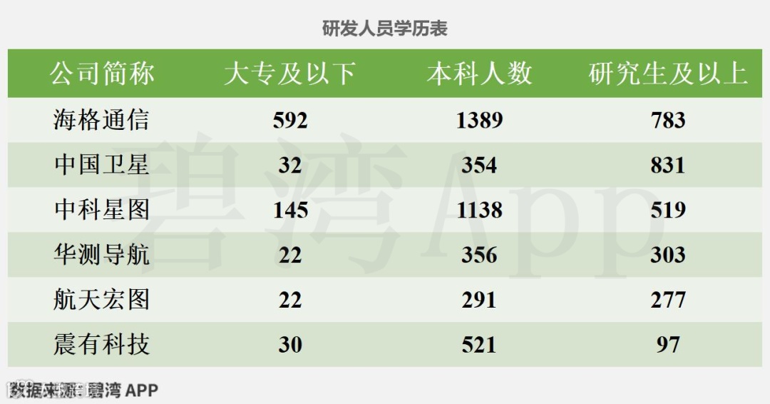 中国卫星的研发团队中,研究生及以上学历的比例最高,达到68.28%,体现了其高学历人才的优势。海格通信的大专及以下学历员工占比最高,为21.42%,显示出其在研发团队构成上的多样性。