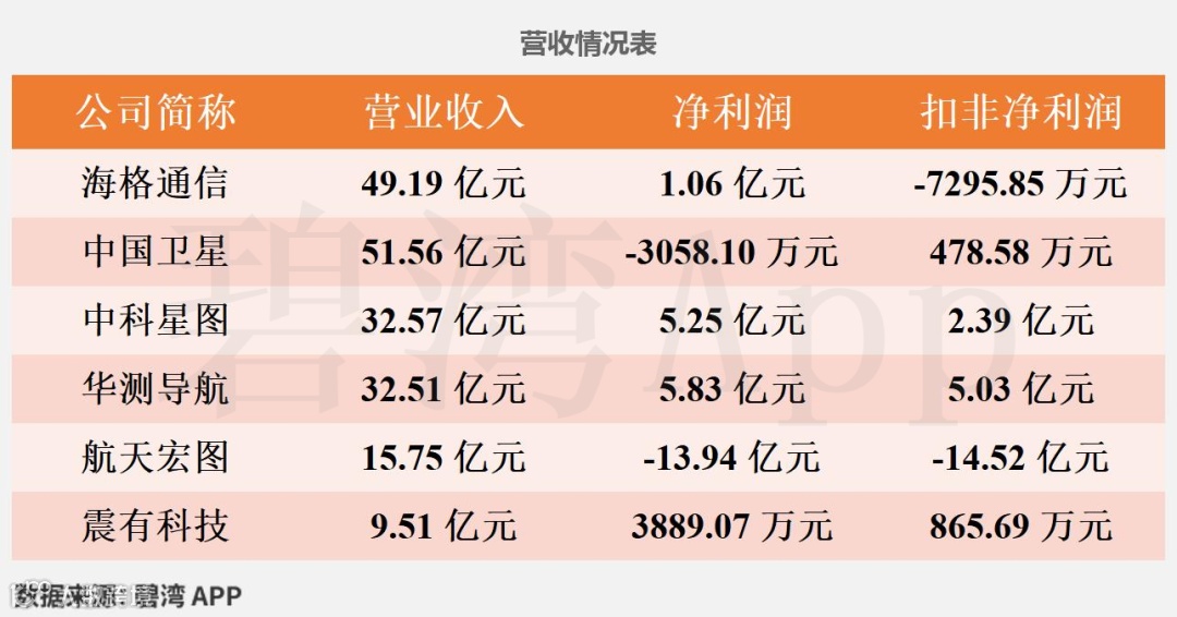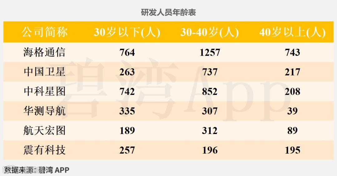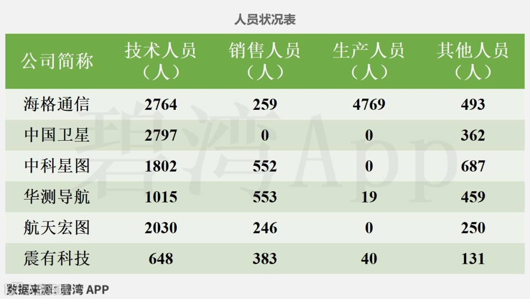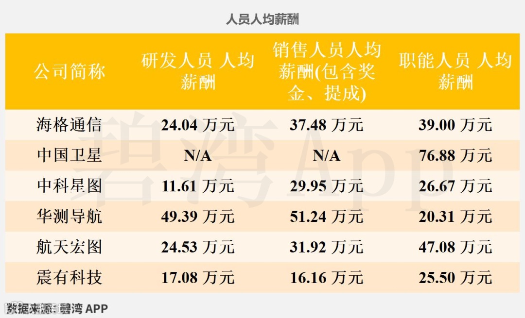 根据海格通信(002465)、华测导航(300627)、中国卫星(600118)、航天宏图(688066)、震有科技(688418)、中科星图(688568)公开披露数据,对6家公司的营收、人员效率等数据统计如下(本文中的员工薪酬包含福利以及五险一金):