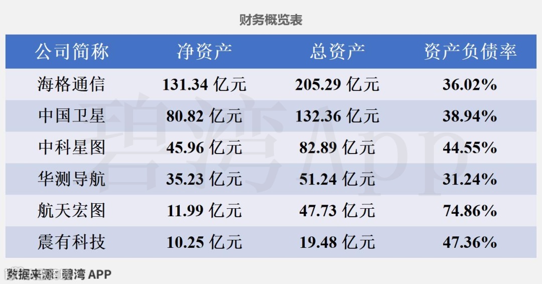 海格通信拥有最高的净资产(131.34亿元)和总资产(205.29亿元),展现了其强大的财务实力。然而,航天宏图的资产负债率高达74.86%,远高于其他企业,表明其债务负担较重。华测导航资产负债率最低,仅为31.24%,显示出较好的财务健康状况。