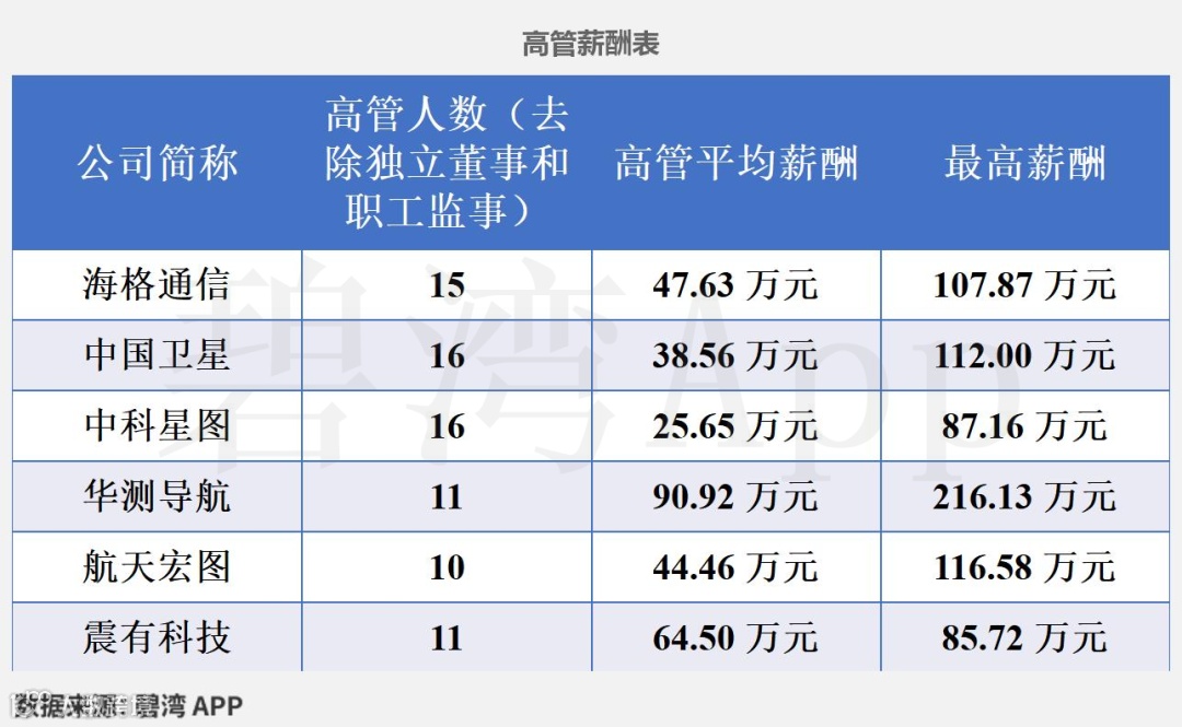 华测导航的高管平均薪酬最高,为90.92万元,显示出其对高层管理者的高薪激励策略。中科星图的高管平均薪酬最低,为25.65万元。最高薪酬方面,华测导航的某位高管年薪高达216.13万元。