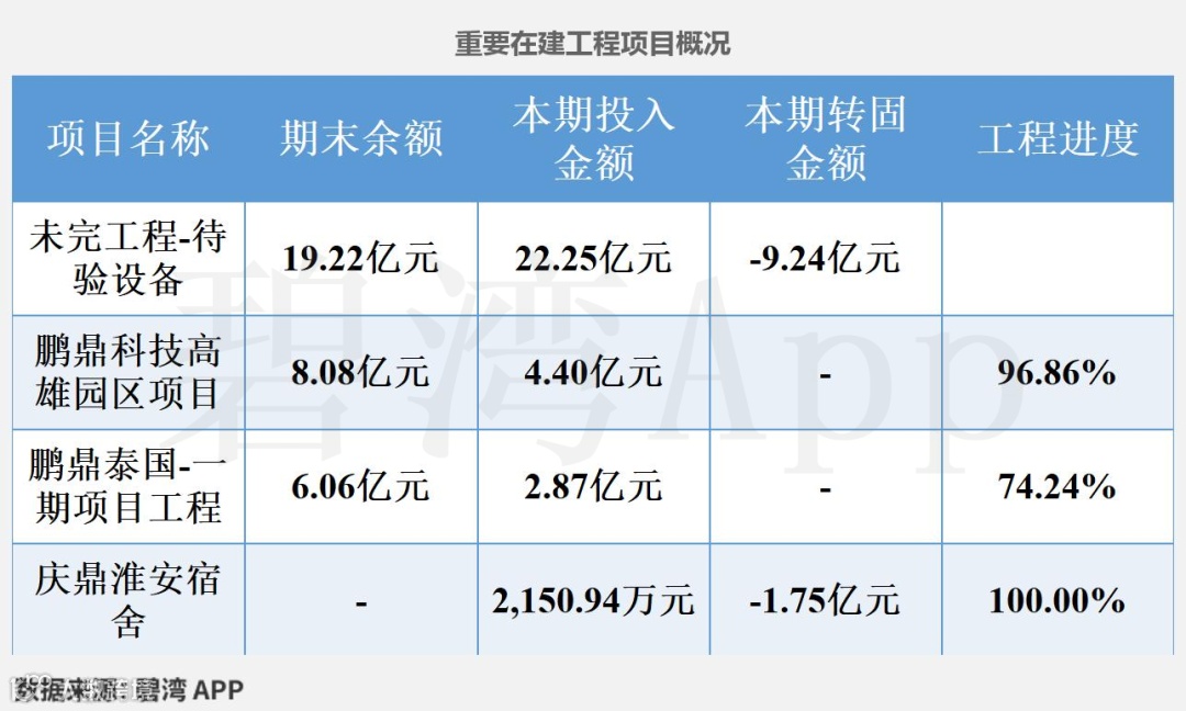 2025半年度,鹏鼎控股在建工程余额合计36.42亿元,相较期初的13.82亿元大幅增长。主要在建的重要工程是未完工程-待验设备、鹏鼎科技高雄园区项目等。