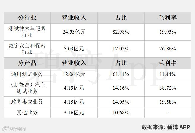 公司的主要业务为测试技术与服务行业,占比高达82.98%,主要产品包括通用测试业务和(新能源)汽车测试业务两项,其中通用测试业务占比61.11%,(新能源)汽车测试业务占比14.16%。