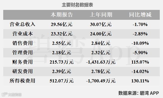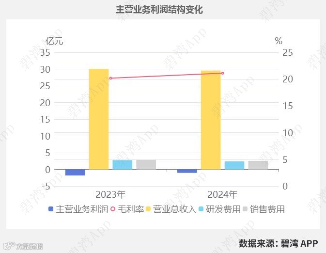 虽然营业总收入本期为29.56亿元,同比有所下降1.70%,不过(1)研发费用本期为2.39亿元,同比小幅下降14.02%;(2)销售费用本期为2.55亿元,同比小幅下降10.09%;(3)毛利率本期为21.11%,同比小幅增长了0.94%,推动主营业务利润亏损有所减小。