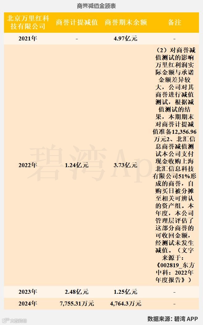 北京万里红科技有限公司由于业绩没达到预期,分别在2022年减值1.24亿元、2023年减值2.48亿元、2024年减值7,755.31万元,具体情况如下所示: