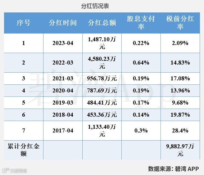 公司上市9年来虽然坚持分红7年,但累计分红金额仅9,882.97万元,而累计募资金额却有36.94亿元。