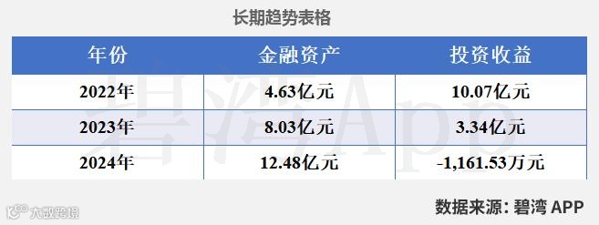 企业的金融投资资产持续大幅上升,由2022年的4.63亿元大幅上升至2024年的12.48亿元,变化率为169.71%,而企业的金融投资收益持续大幅下滑,由2022年的10.07亿元大幅下滑至2024年的-1,161.53万元,变化率为-101.15%。