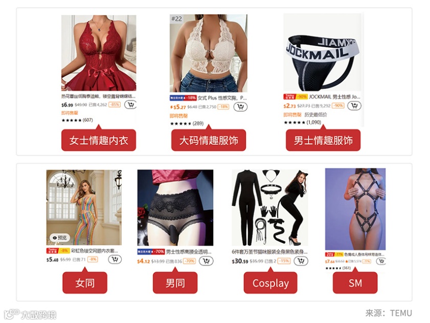 TEMU设有“女士情趣内衣”“大码情趣服饰”“男士情趣服饰”三大类目,SKU丰富,款式新颖。热销单品销量达3万件以上,新品上架半年内占比达78%,三个月内占48%,更新频率极高。 爆款示范多为蕾丝、镂空设计,强调视觉冲击力。“蕾丝”“透视”“套装”覆盖超八成热销商品,辅以皮革、豹纹、挑逗文字及水手/学院风等元素。颜色偏好从传统黑白扩展至深紫、勃艮第红、玫瑰红、宝石蓝等大胆色调。 价格几乎全部低于10美元,主销区间为5美元以下,依托源头工厂实现低成本高利润运作。