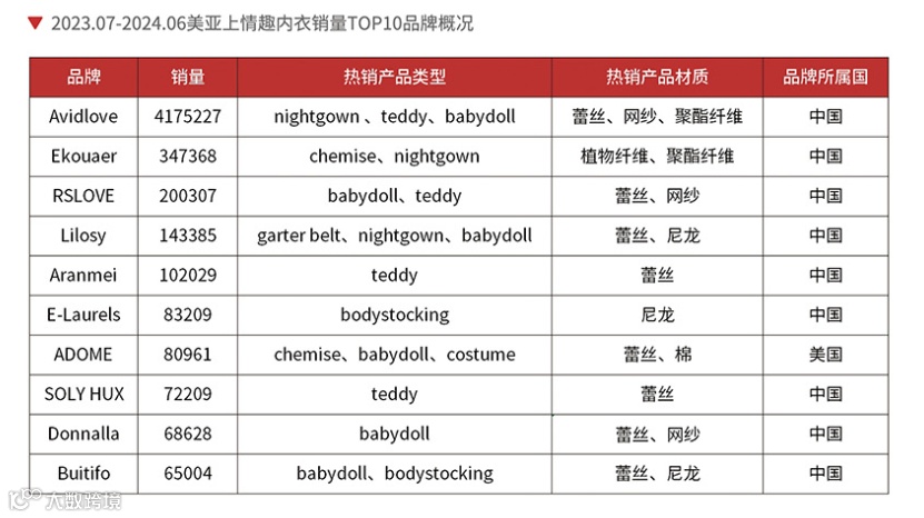 美国亚马逊以性别划分情趣服饰类目,女士品类涵盖睡衣、束腰、丝袜、内裤等,男士仅限四角裤、三角裤和丁字裤三种,市场重心明显偏向女性用户。 “sexy lingerie for women”已成为搜索量最高的关键词,超过通用词“lingerie for women”;“plus size lingerie”保持稳定热度,是细分领域的重要增长点。色彩方面,紫、粉、红等鲜艳配色更受欢迎;主流款式包括chemise(无袖短裙)、babydoll(宽松短裙)和teddy(连体式)。 品牌端,赛维时代旗下Avidlove、Ekouaer进入销售额TOP10,其中Avidlove年销售额约7500万美元,市场份额近66%,销量超417万件。TOP10品牌占据热销子类目总销量的82.6%。 价格集中在10-25美元区间,为主流消费接受范围。Lilosy主打吊带袜,ADOME专注制服风,凭借差异化切入25美元以上价位;E-Laurels则以10美元以下丝袜、连体袜走量,提升复购。