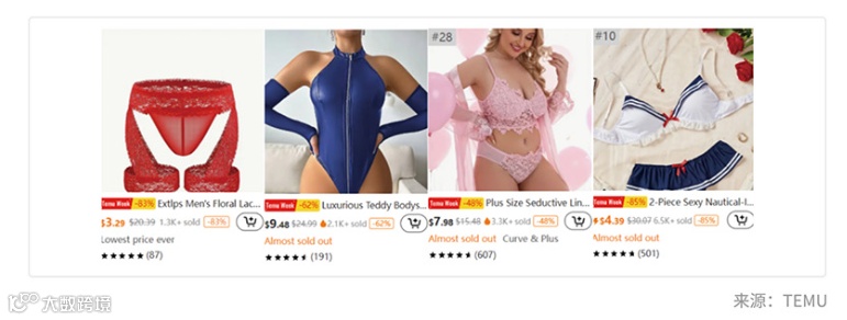 3、TEMU:高上新率+低价策略,蕾丝透视主导爆款