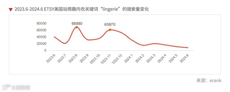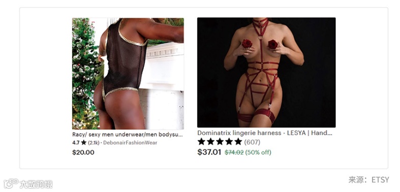 ETSY的情趣内衣分布于女士内衣、男士内裤、中性成人服饰等多个类目,整体风格更为开放多元。“lingerie”“sexy lingerie”为垂直流量入口,夏季与年末为搜索旺季。 长尾关键词如“wife\mom”“nun”“embroidery”“emerald”热度高,反映特定角色与工艺偏好。尽管“underwear”“bra”等大词下也有情趣款出现,但多为低价平庸设计。 平台专设鱼骨束腰、绑带文胸等小众高客单价类目,支持手工定制,平均售价超20美元。定制化礼品需求旺盛,包含伴侣姓名、头像、情话等元素的产品广受欢迎,成为情感表达载体。