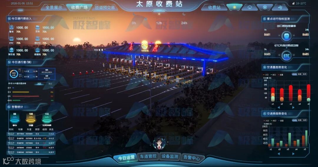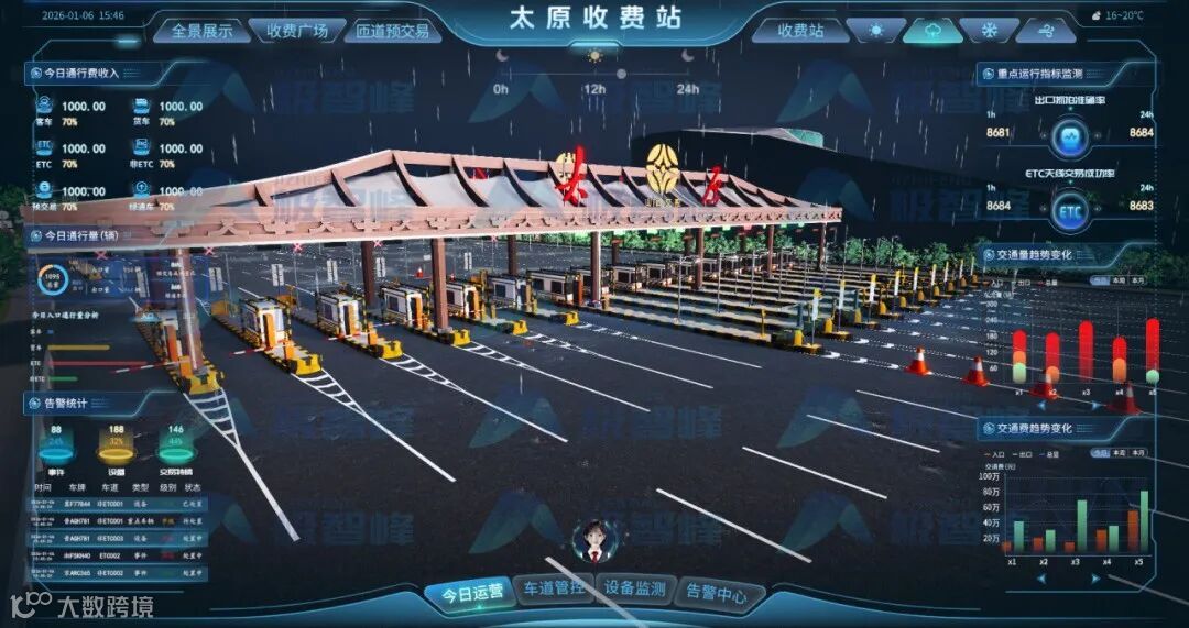 实现收费站全场景三维孪生可视化,支持空间漫游、车辆与设备动态跟踪、告警与事件直观呈现。