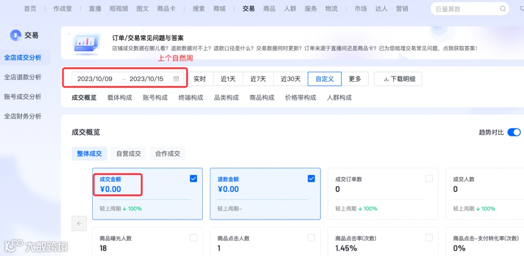 上周成交金额可通过“罗盘 - 交易”页面查询(时间窗口选择上一个自然周):