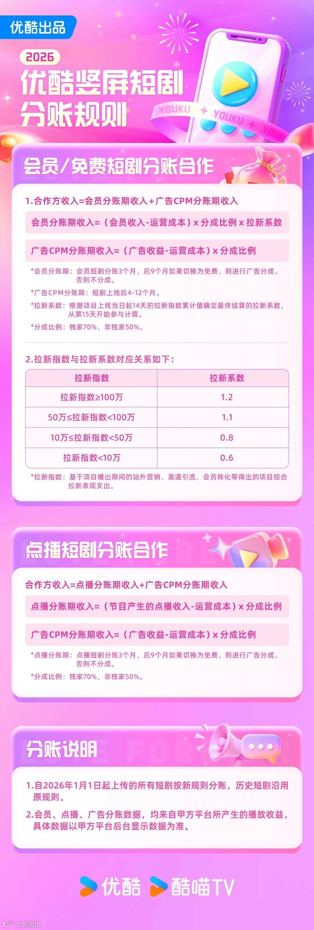 近日,优酷正式公布了2026年竖屏短剧分账合作规则,进一步明确会员、点播与广告分账模式。根据新规,合作方收入主要由“会员分账期收入+广告CPM分账期收入”或“点播分账期收入+广告CPM分账期收入”构成。