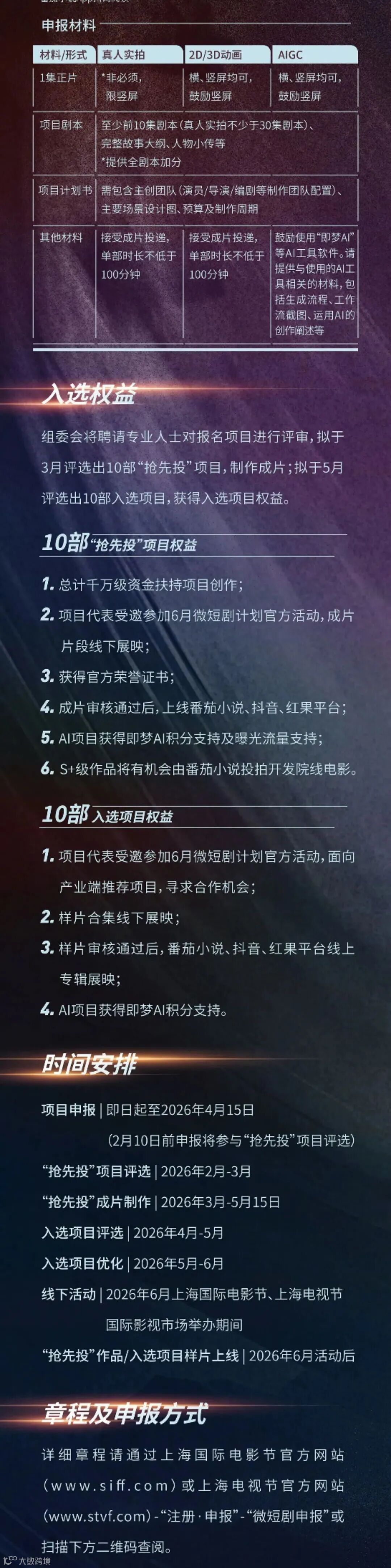 在资金扶持上,组委会将于3月评选10部“抢先投”项目,给予总计千万级资金支持,直接推动项目进入实拍与成片阶段;5月再遴选10部入选项目,进入重点展示与产业对接通道。