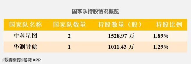 国家队持股情况显示,中科星图和华测导航被国家队持有。中科星图被两只国家队持有,分别是全国社保基金五零三组合和全国社保基金一一一组合,合计持股比例为1.89%。华测导航则被全国社保基金四一四组合持有,持股比例为1.29%。