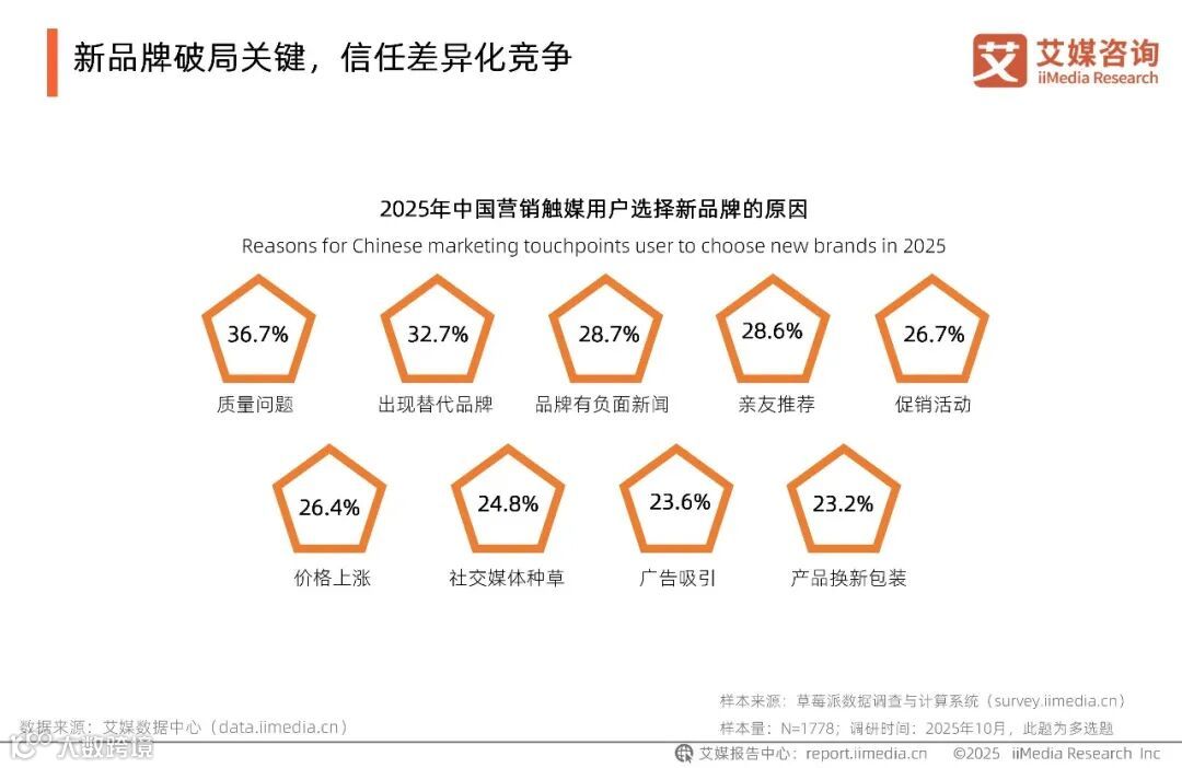 iiMedia Research(艾媒咨询)数据显示,36.7%的消费者会因为原品牌的质量问题选择新品牌,32.7%会因为出现替代品牌而选择新品牌。艾媒咨询分析师认为,现有品牌的质量问题与负面新闻削弱了用户信任,推动用户转向替代品牌或通过亲友推荐等方式选择新品牌,凸显用户对品牌可靠性与新鲜价值的双重需求,也意味着新品牌需更注重以信任为核心的差异化竞争。