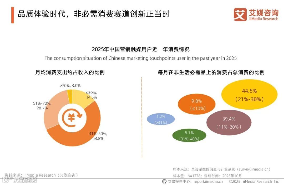 iiMedia Research(艾媒咨询)数据显示,消费者月均消费支出占收入比例多集中于中高区间,同时非生活必需品消费占比也相对较高。艾媒咨询分析师认为,消费结构正从“刚需满足”向“品质体验”进阶。对行业而言,需顺应消费分化的趋势,在非必需消费领域着力提升产品品质、挖掘情绪价值,并在健康、智能、国潮等细分赛道加速产品创新与场景迭代,以适配消费升级的新需求。