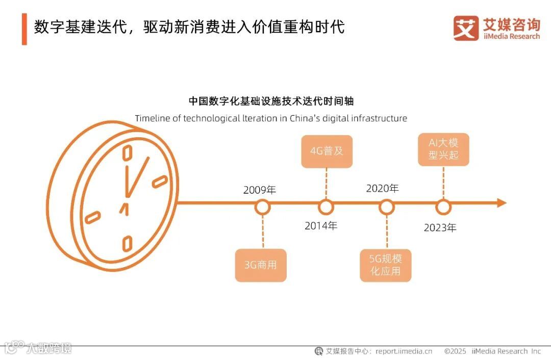 中国数字化基础设施的技术迭代,深度重塑着新消费行业的演进逻辑。从3G时代电商初步崛起,到4G时代移动支付、社交电商爆发,再到5G时代直播带货、虚拟试穿等沉浸式场景普及,每一代通信技术都拓展了消费的渠道与场景边界;而2023年以来AI大模型的兴起,更将新消费推向智能化、个性化新阶段。艾媒咨询分析师认为,这种技术与消费的同频共振,本质是基础设施升级不断释放需求潜力,新消费行业从“渠道变革”走向“价值重构”,形成技术驱动、用户需求引领的动态发展格局。