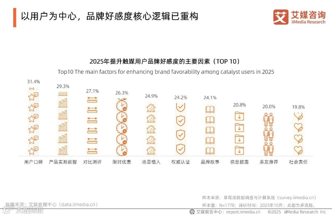 iiMedia Research(艾媒咨询)数据显示,用户口碑(31.4%)、产品实测数据(29.3%)是提升品牌好感度的重要因素。艾媒咨询分析师认为,消费者对品牌好感度的建立更依赖真实用户反馈、客观产品信息及与自身价值观契合的情感连接,这种需求变化直接推动了用户口碑、产品数据等因素成为提升品牌好感度的核心,反映出当下营销已从“品牌自说自话”转向“以用户为中心”的深度变革。
