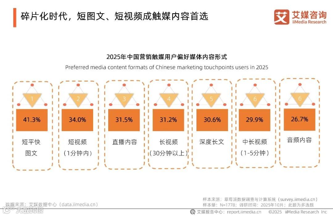 iiMedia Research(艾媒咨询)数据显示,营销触媒用户喜欢短平快图文(41.3%)和1分钟以内短视频(34.0%)的内容形式。艾媒咨询分析师认为,短平快图文、短视频类触媒以轻量化、趣味性内容适配用户碎片时间。营销触媒可以结合内容形式的偏好差异,定制化输出内容,提升用户触达与转化效率。