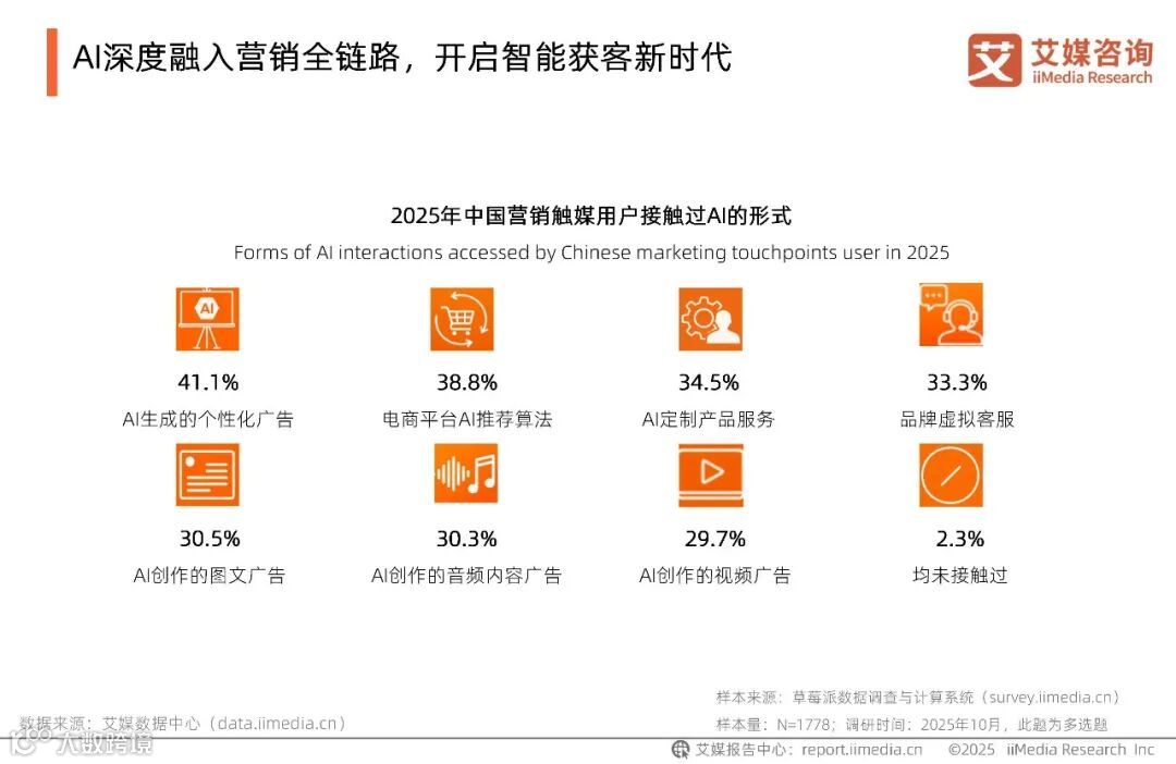 iiMedia Research(艾媒咨询)数据显示,在AI应用场景中,用户接触最多的是AI生成的个性化广告(41.1%),其次是电商平台AI推荐算法(38.8%)。艾媒咨询分析师认为,新消费时代,品牌为应对消费者个性化需求与提升营销效率,加速将AI嵌入广告、推荐、客服等全链路环节,使得多数营销触媒用户已接触多种AI交互形式,推动行业从流量驱动向精准化、智能化转型。