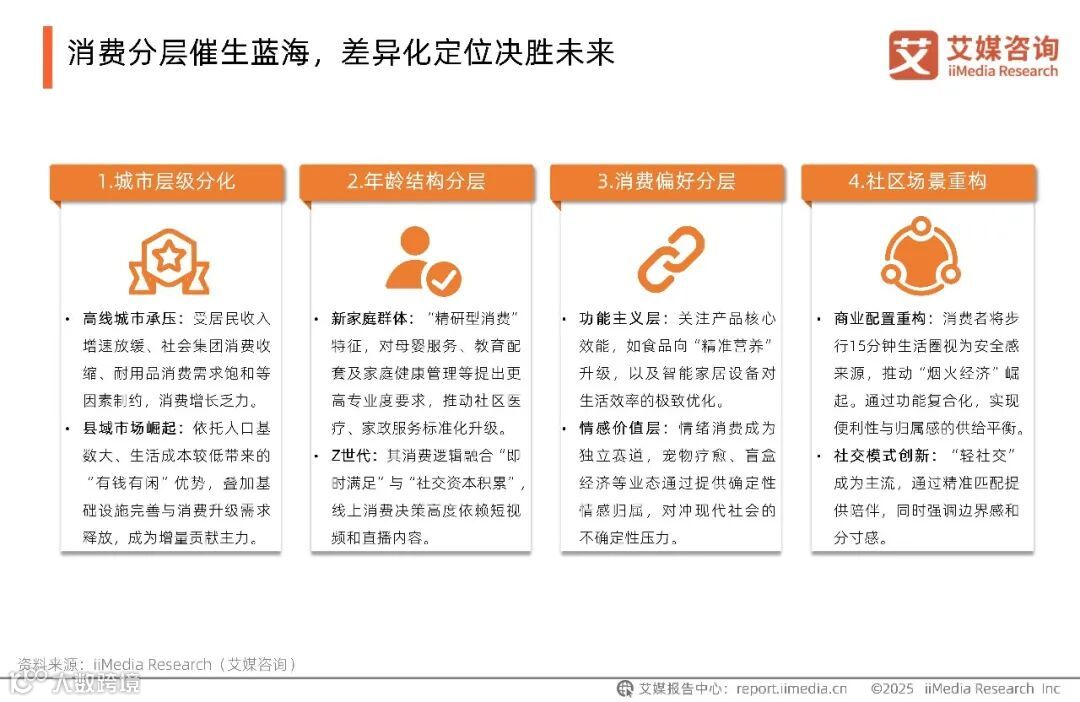 近年来,中国新消费需求呈现出显著的分层化趋势,不同群体在消费能力、偏好及场景选择上差异明显。艾媒咨询分析师认为,新消费时代,城市层级、年龄结构与消费偏好的分层趋势,正催生出差异化的商业机遇,各市场主体需打破“均质化供给”的路径依赖,在分层市场中精准定位核心客群的价值坐标,方能实现供需关系的动态平衡和可持续增长。