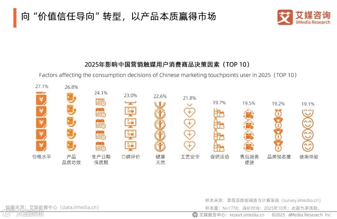 iiMedia Research(艾媒咨询)数据显示,影响中国营销触媒用户消费商品的TOP10因素中,价格水平(27.1%)、产品品质功效(26.8%)、生产日期/保质期(24.1%)占比较高。艾媒咨询分析师认为,新消费趋势下,消费者决策更强调“价值感与信任感”,既关注价格与品质的平衡,也日益重视产品的安全属性及口碑验证,这要求行业需回归产品本质,以高性价比、强信任背书和优化使用体验来构建核心竞争力。