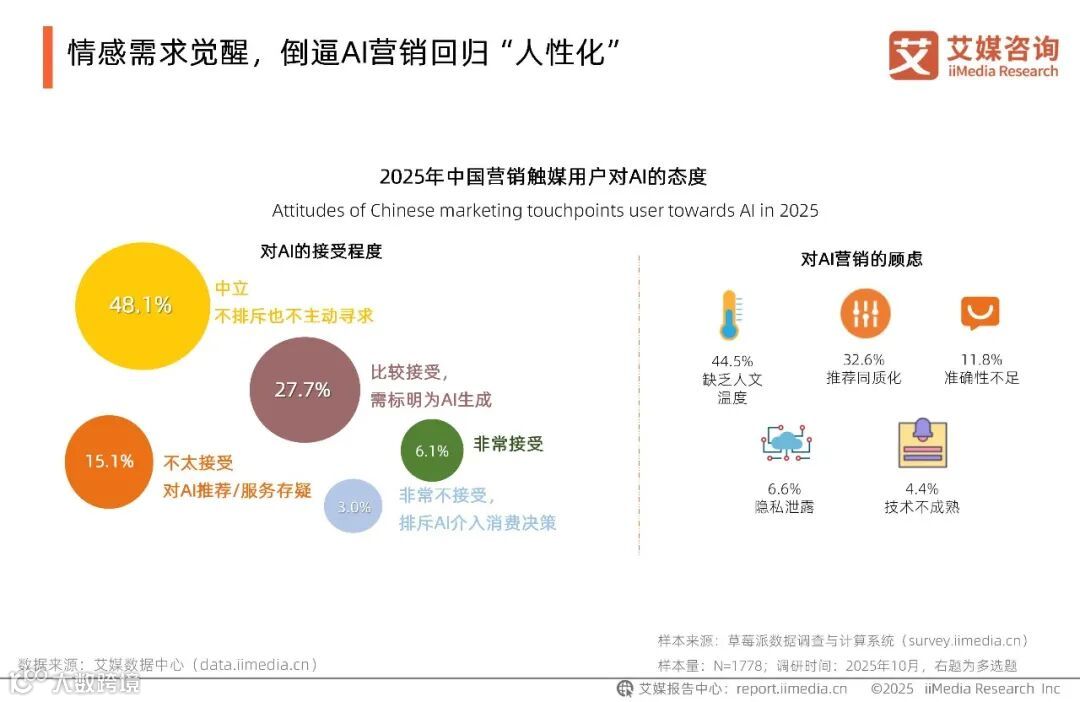 iiMedia Research(艾媒咨询)数据显示,用户对“情感共鸣”与“透明化体验”的需求愈发凸显,AI营销因普遍存在缺乏人文温度、推荐同质化等问题,难以匹配用户对“有温度的个性化服务”的期待,导致多数用户对AI保持中立或要求标明身份的谨慎态度。这也倒逼行业重新调整AI应用逻辑,推动“技术理性”与“人文感性”的融合,促使品牌在使用AI时更注重情感连接与透明化。
