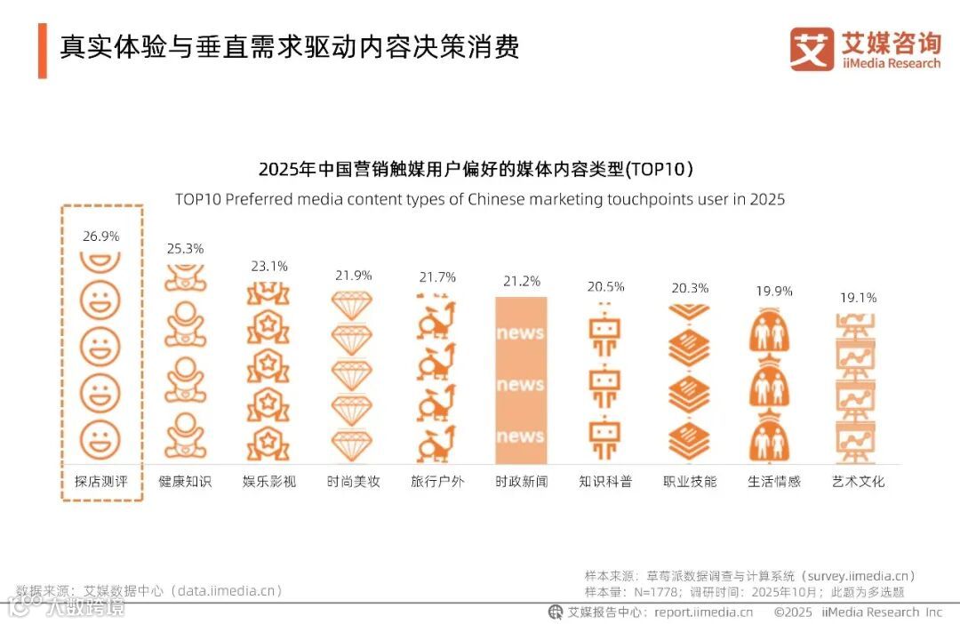 iiMedia Research(艾媒咨询)数据显示,营销触媒用户偏好探店测评(26.9%)和健康知识(25.3%)的内容类型。艾媒咨询分析师认为,用户消费决策更依赖真实体验与垂直化需求满足,探店测评等场景化内容因贴近生活、传递真实价值成为关注TOP,而健康、影视、美妆等细分领域内容的高占比,体现出消费升级下用户对品质、个性化及自身需求的重视,推动营销内容向更精准、更有温度的方向演变。