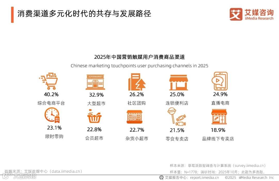 iiMedia Research(艾媒咨询)数据显示,超四成的消费者选择综合电商平台购买商品,其次是大型超市(32.9%)、社区团购(26.2%)、连锁便利店(25.0%)。艾媒咨询分析师认为,当前商品购买渠道呈现线上主导、线下便民化互补的特征。消费渠道的多元化趋势要求各渠道强化核心优势,电商需优化供应链与用户体验,线下渠道应着力打造场景化消费,直播电商则需提升内容可信度,以此适配消费者日益多元的需求。