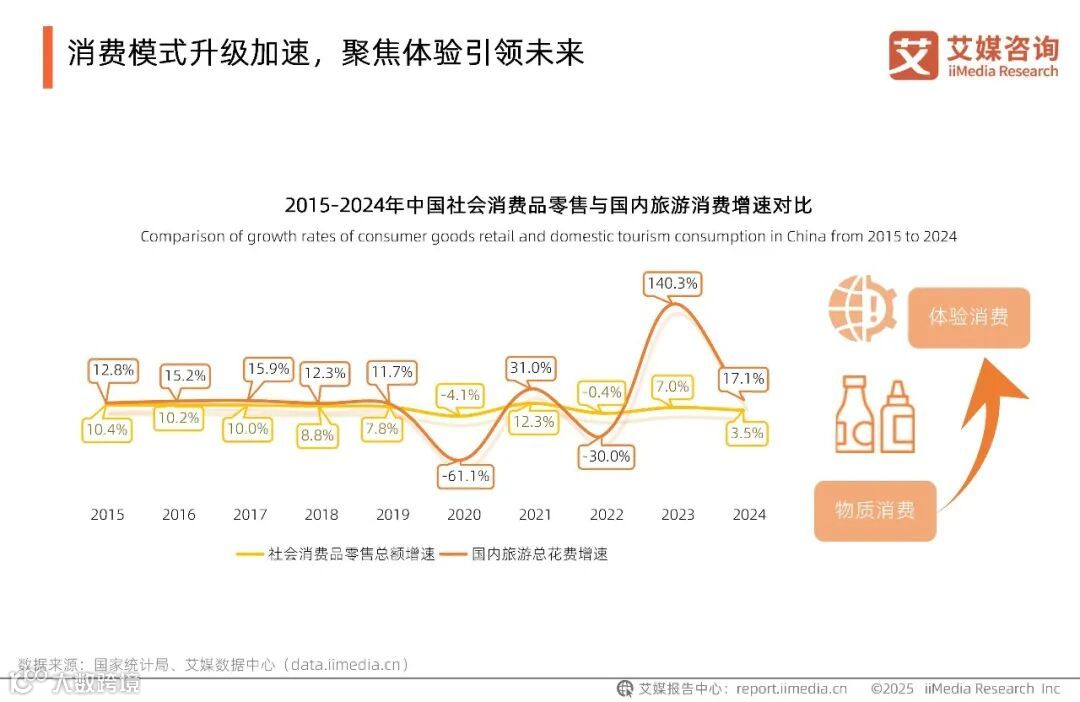 数据显示,2024年社会消费品零售总额同比增长3.5%,国内旅游总花费则增幅17.1%。物质消费增长平稳,而体验型消费波动显著。艾媒咨询分析师认为,消费模式正由以满足基本生活需求为主的“生存型消费”,逐步向追求品质、体验与自我实现的“发展型消费”转变。未来消费增长或将进一步聚焦于体验消费,其中注重场景化、情感化的体验型消费有望成为核心驱动力。