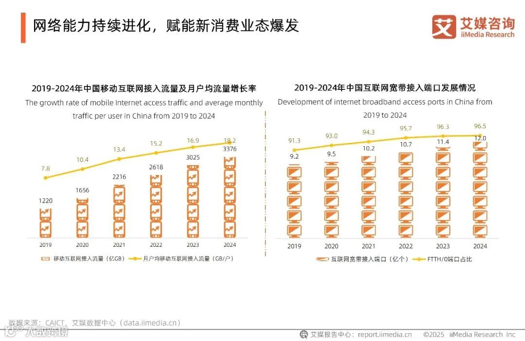 数据显示,2019-2024年中国移动互联网接入流量及月户均流量、互联网宽带接入端口逐年增长。2024年移动互联网接入流量达3376亿GB,互联网宽带接入端口达12.0亿个。艾媒咨询分析师认为,移动互联网流量与宽带接入端口的持续增长及光纤化升级,为新消费行业提供了坚实网络基础,推动线上购物、直播电商、智能设备等新型消费场景快速发展,成为新消费增长的重要支撑。