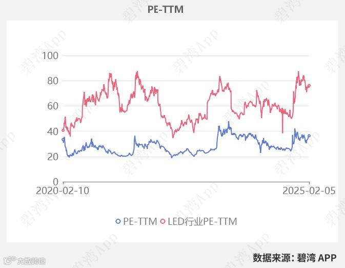 在2025年02月05日,聚飞光电的PE-TTM是36.41,而LED行业的PE-TTM是76.24,聚飞光电的PE-TTM远低于LED行业的PE-TTM。