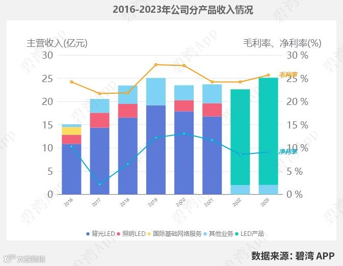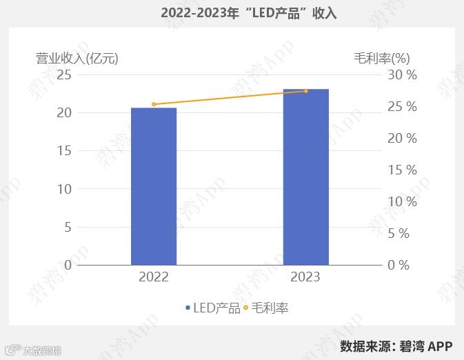2023年LED产品营收23.08亿元,同比去年的20.62亿元小幅增长了11.93%。同期,2023年LED产品毛利率为27.39%,同比去年的25.3%小幅增长了8.26%。