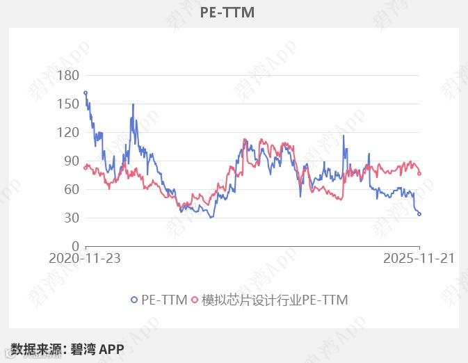 在2025年11月21日,芯朋微的PE-TTM是33.72,而模拟芯片设计行业的PE-TTM是76.35,芯朋微的PE-TTM远低于模拟芯片设计行业的PE-TTM。