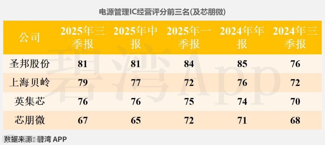 芯朋微在2025年三季报经营评分排名为第2342名,在电源管理IC行业中排名为4名。