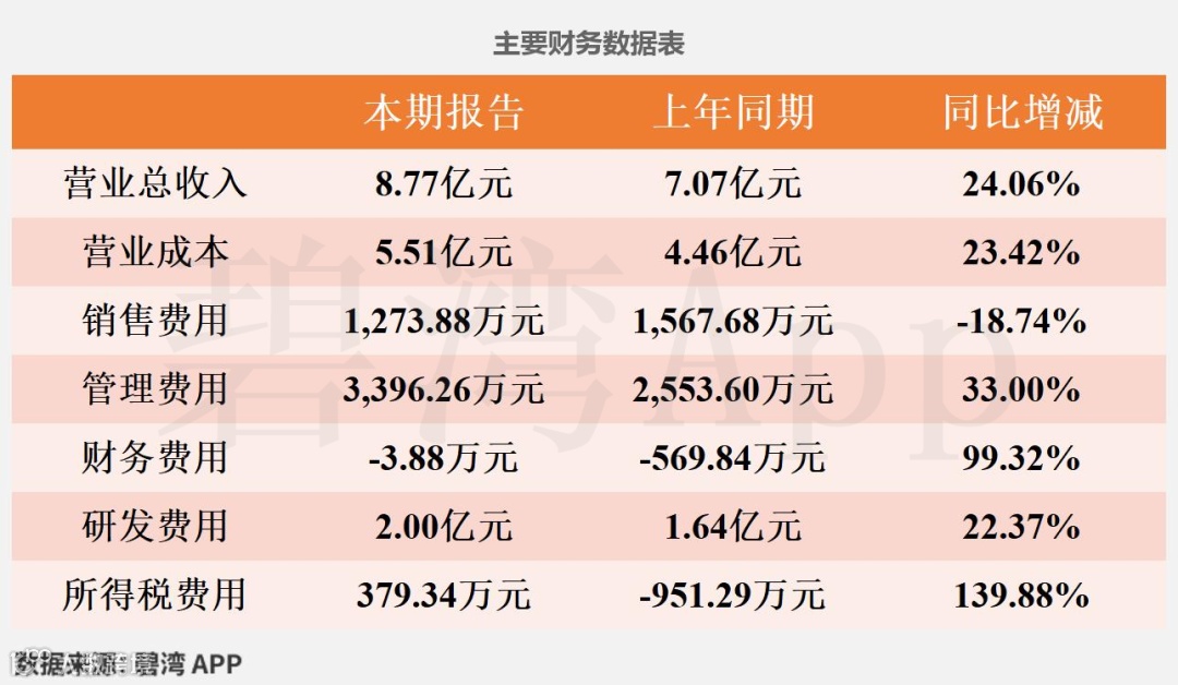 虽然研发费用本期为2.00亿元,同比增长22.37%,不过营业总收入本期为8.77亿元,同比增长24.06%,推动主营业务利润同比增长。