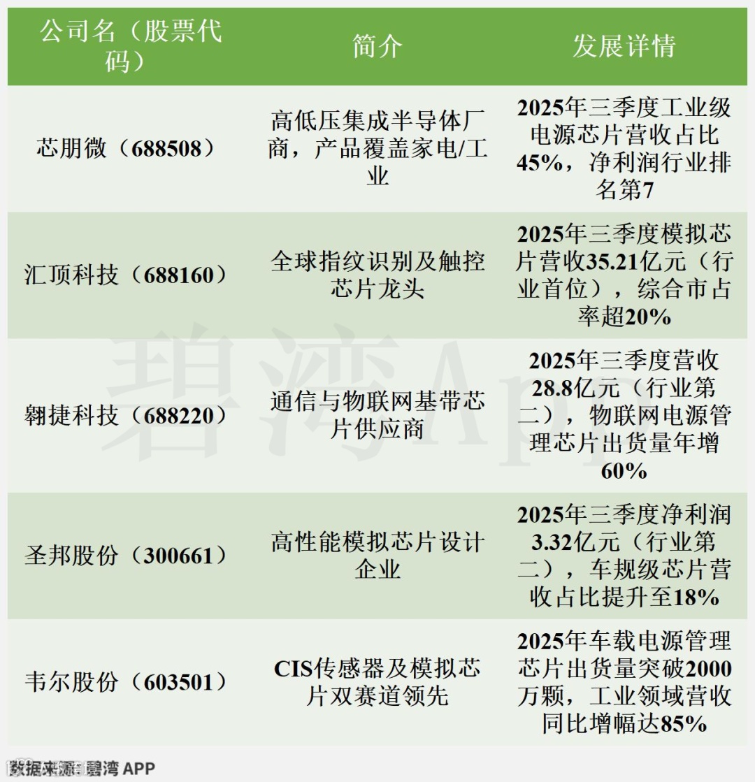 芯朋微2025年三季度营收8.77亿元,位列国内模拟芯片设计行业第14名,净利润1.77亿元居行业第7位。其工业级电源芯片市场份额快速提升,工业产品毛利率领先同业,在中高端家电及服务器市场占有中等偏上地位。